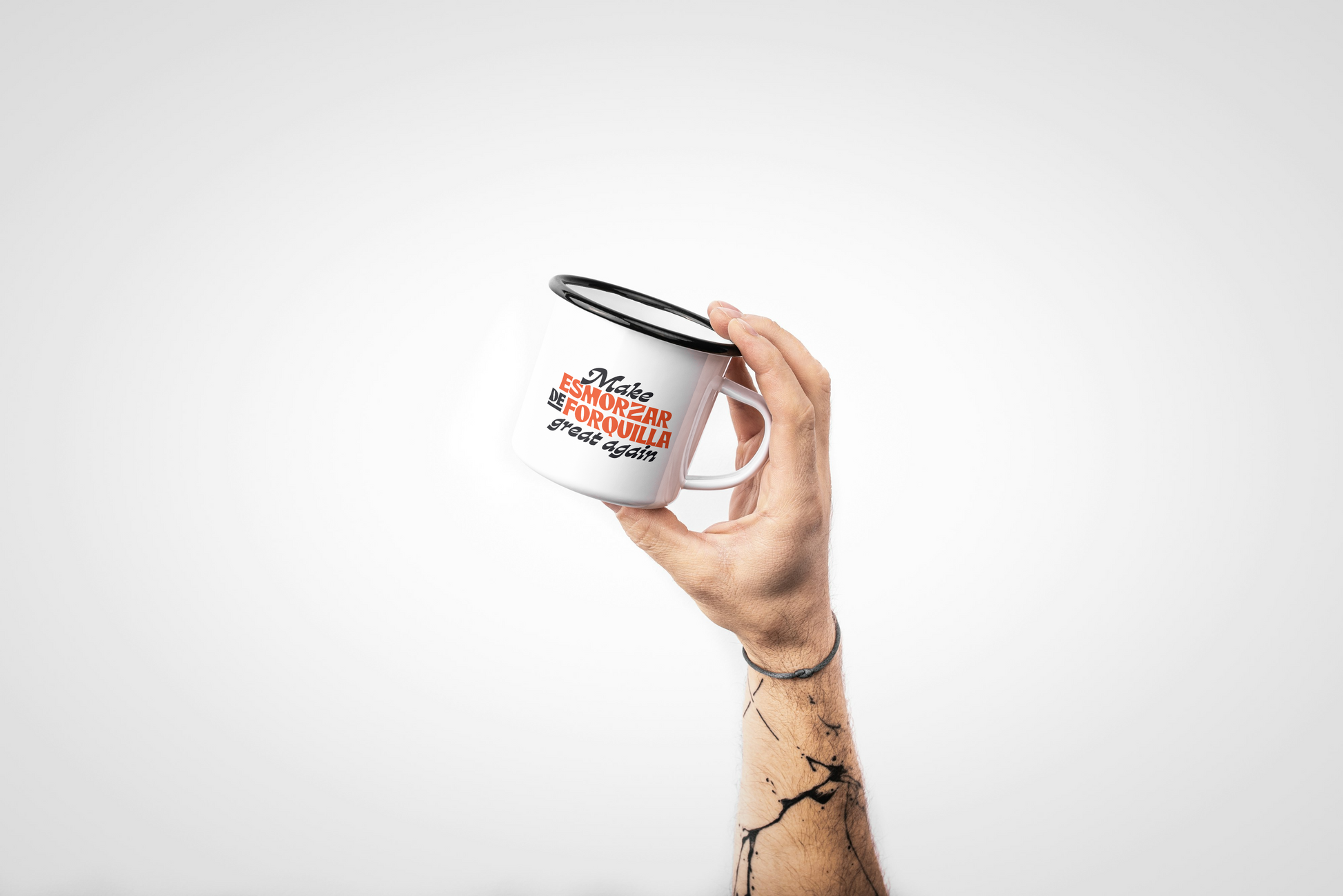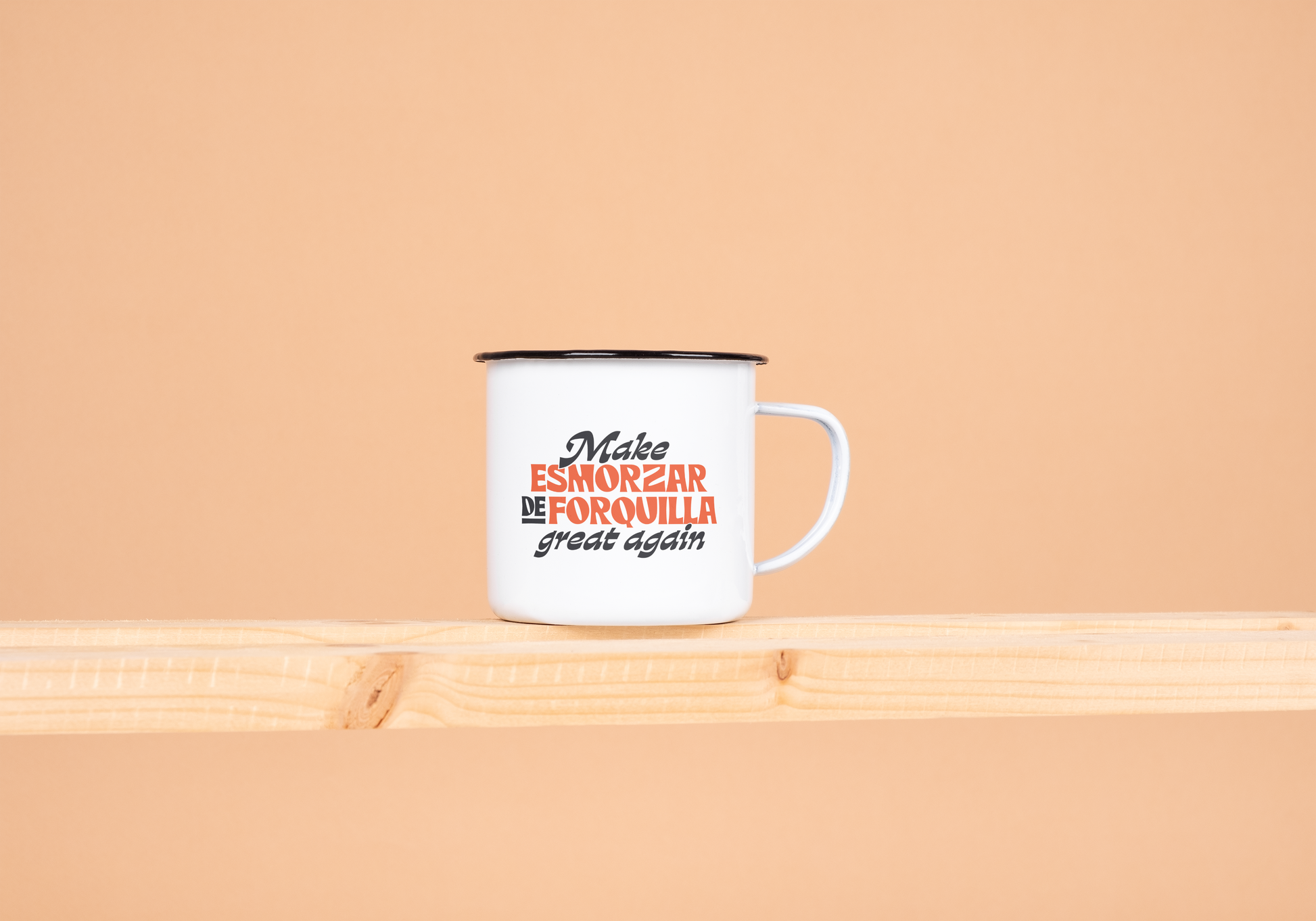 Taza metálica con el 'Make Esmorzar de Forquilla Great Again" y logo CAPiPOTA.